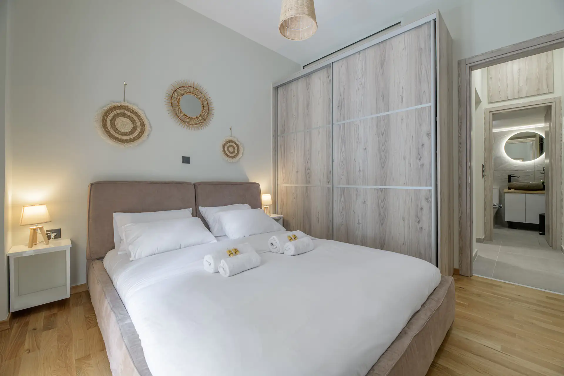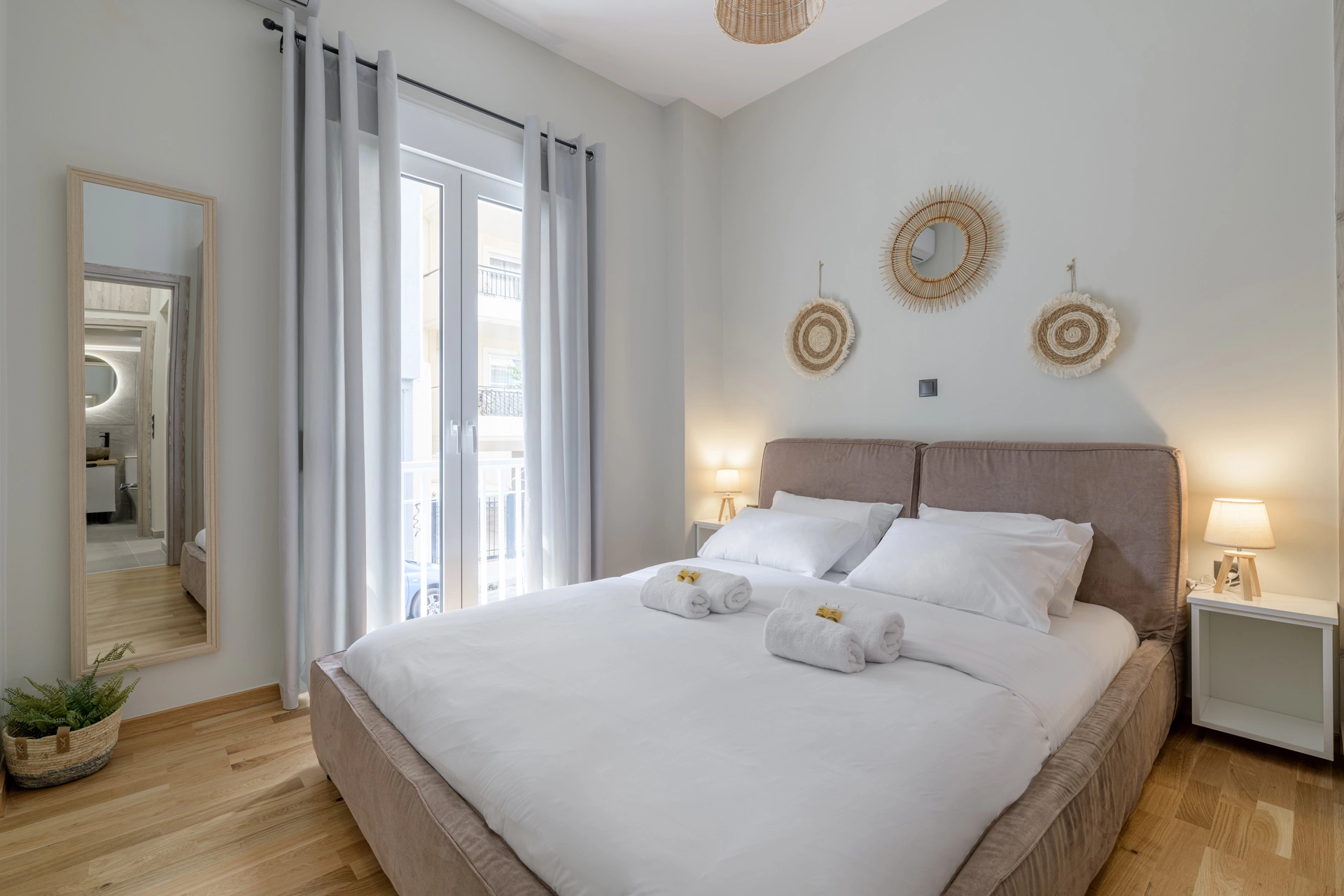 Μοντέρνο υπνοδωμάτιο με ουδέτερους τόνους και φυσικό φωτισμό, που προσφέρει εμπειρία ξενοδοχειακού επιπέδου.